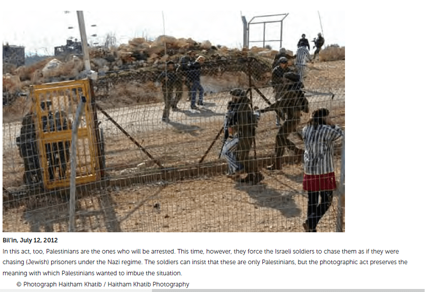 The next incident occurred in the U.S, courtesy of BDS activist Prof. Ariella Azoulay of Brown University. Azulay has been accused of depicting Israeli Jews as apes in her “artwork.” In her other images, Israeli-Jews are dehumanized, darkened, and erased. These anti-Semitic visuals have prompted a group “Stop Antisemitism Now” to urge readers to file a Discrimination and Harassment Complaint to Brown University in order to insist they discipline or dismiss Azoulay. Azoulay is notorious for anti-Israel activism. Prof. Beshara Doumani, the former chair of Palestine Studies at Brown, a radically anti-Israel Palestinian, recruited Azoulay for this purpose. Apparently, Azoulay was so eager to show Palestinian bona-fide that she added Aisha as her second name. In 2013, IAM reported that Azoulay depicted Israel as a Nazi-like state when she presented in an exhibition an image of a group of Palestinians wearing prisoners’ uniforms, chased by Israeli soldiers and pictured behind a metal fence. The caption stated, “Palestinians are the ones who will be arrested… they force the Israeli soldiers to chase them as if they were chasing (Jewish) prisoners under the Nazi regime.”