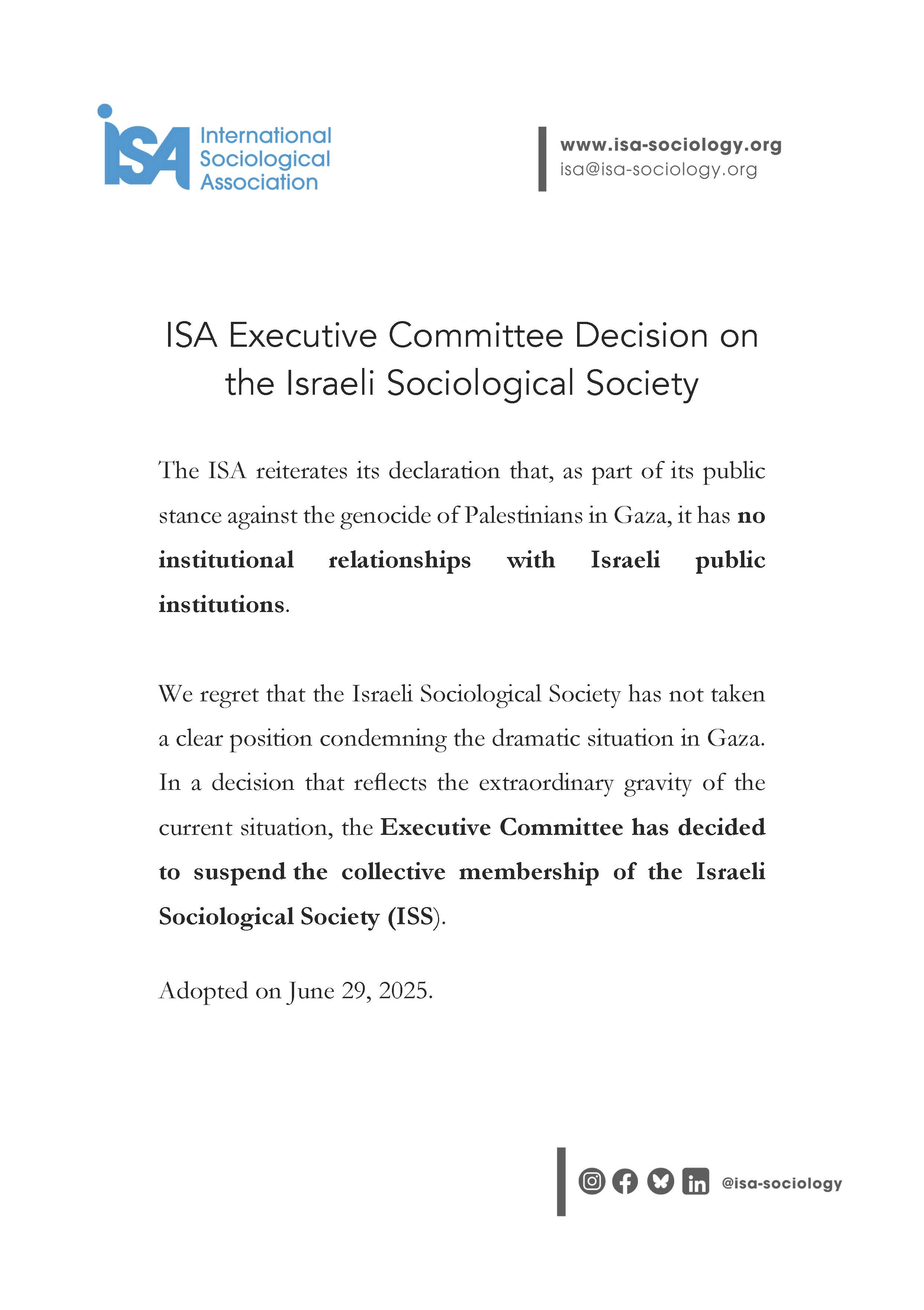 We regret that the Israeli Sociological Society has not taken a clear position condemning the dramatic situation in Gaza. In a decision that reflects the extraordinary gravity of the current situation, the Executive Committee has decided to suspend the collective membership of the Israeli Sociological Society (ISS).