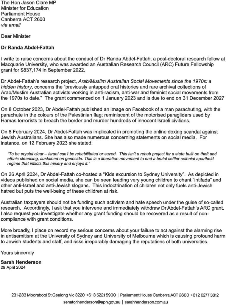 Lambie gave an example of Macquarie University academic Dr. Randa Abdel-Fattah, who said in March 2024 that “Zionists had no right to cultural safety.” Lambie stated that Abdel-Fattah helped to spread a leak of private information on hundreds of Jewish artists. Also, in late April, Abdel-Fattah and an activist group, Parents for Palestine, organised an excursion where primary school children were told to chant “intifada” and “Israel is a terrorist state.” Lambie complained that “Macquarie University has not condemned this academic.”